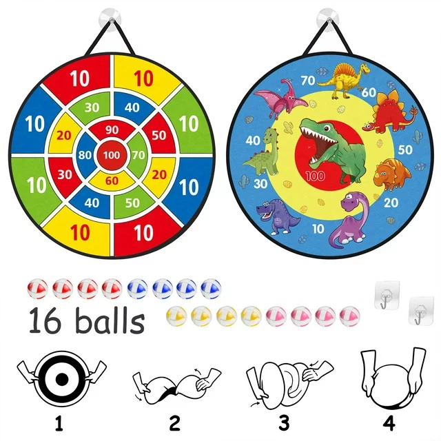 •  1.8" SUPERSIZE STICKY BALLS: You will realize that a large sticky ball can create a joyous atmosphere for the party. Each darts board set contains 16 colorful sticky balls (4 blues & 4 reds & 4 yellows & 4 pinks). High quality and safe hook-and-loop ball ensures that the ball can be 100% firmly attached to the board.