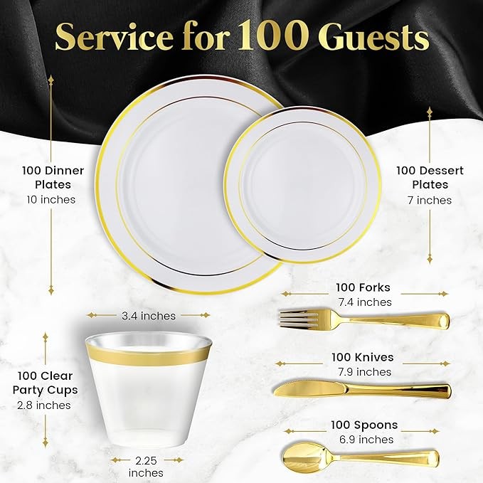 • WHAT’S IN THE BOX??: Each disposable silverware set includes 100 Dinner Plates and 100 Salad, Dessert or Appetizer Plates, 100 9 Oz Clear Disposable Gold Rimmed Plastic Party Cups, and 300 Piece Gold Plastic Silverware Set including 100 Forks, 100 Knives and 100 Spoons. Our heavyweight dinnerware and flatware is similar in size to normal utensils and plate settings and provides for a comfortable culinary experience.