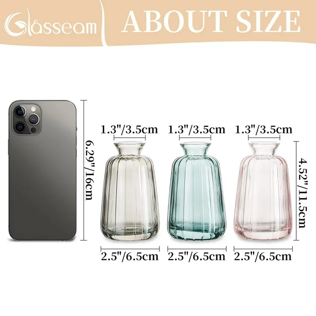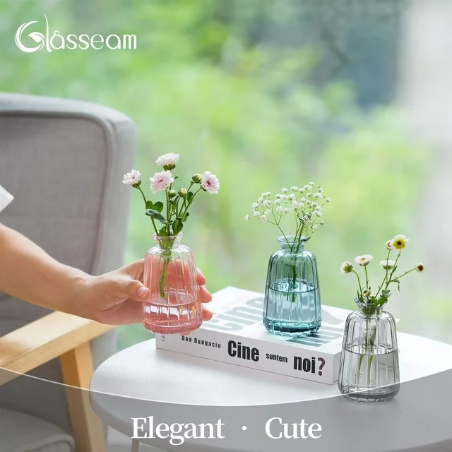 Glasseam Small Glass Bud Vase 4.52"Colorful Cute Ribbed Vases for Flowers Set of 3 (Pink+Grey+Green)