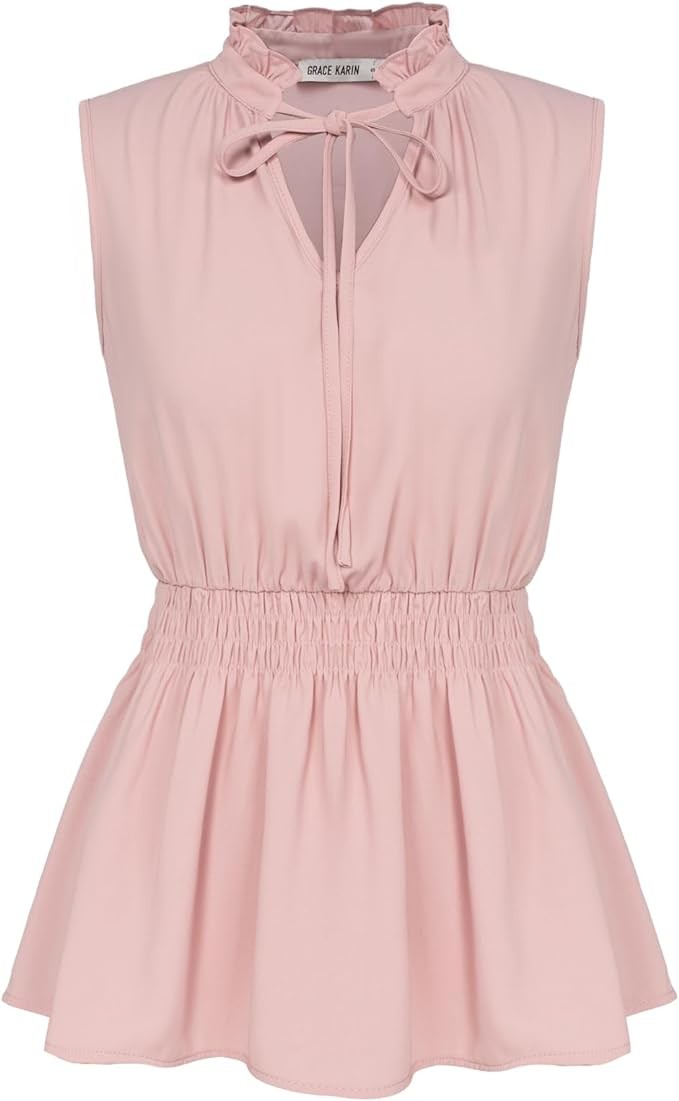 • 【Features】Sleeveless / Stylish Ruffled Stand Collar / V-Neck with String / Elastic Waist Band / Cute Ruffle Hem / Relaxed Fit / Dressy Elegant Casual Blouse / Hip Length / Summer Tops for Women 2024 / Comfortable and Lightweight / Fashion Blouse Top for Women