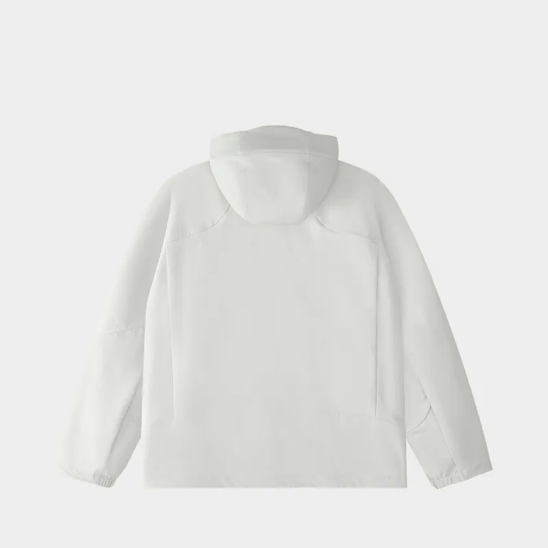 - Woven sun protection hooded jacket, matte slightly thick three-dimensional silicone print on the chest; accordion pleats on the back; green zipper details.
