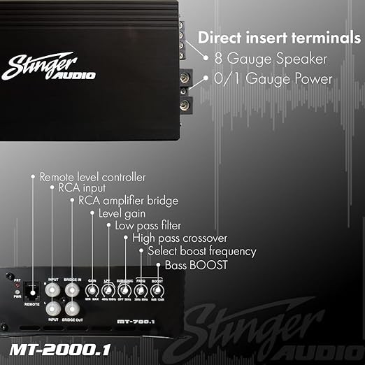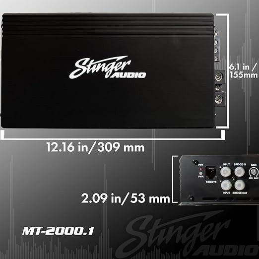 STINGER Audio MT20001 1-Channel Monoblock 2000 Watt RMS Car Audio Subwoofer Amplifier w/Remote Control Bass Knob, Class D, Hexfet Mosfet, Subsonic Filter, Low-Pass Filter, Bass
